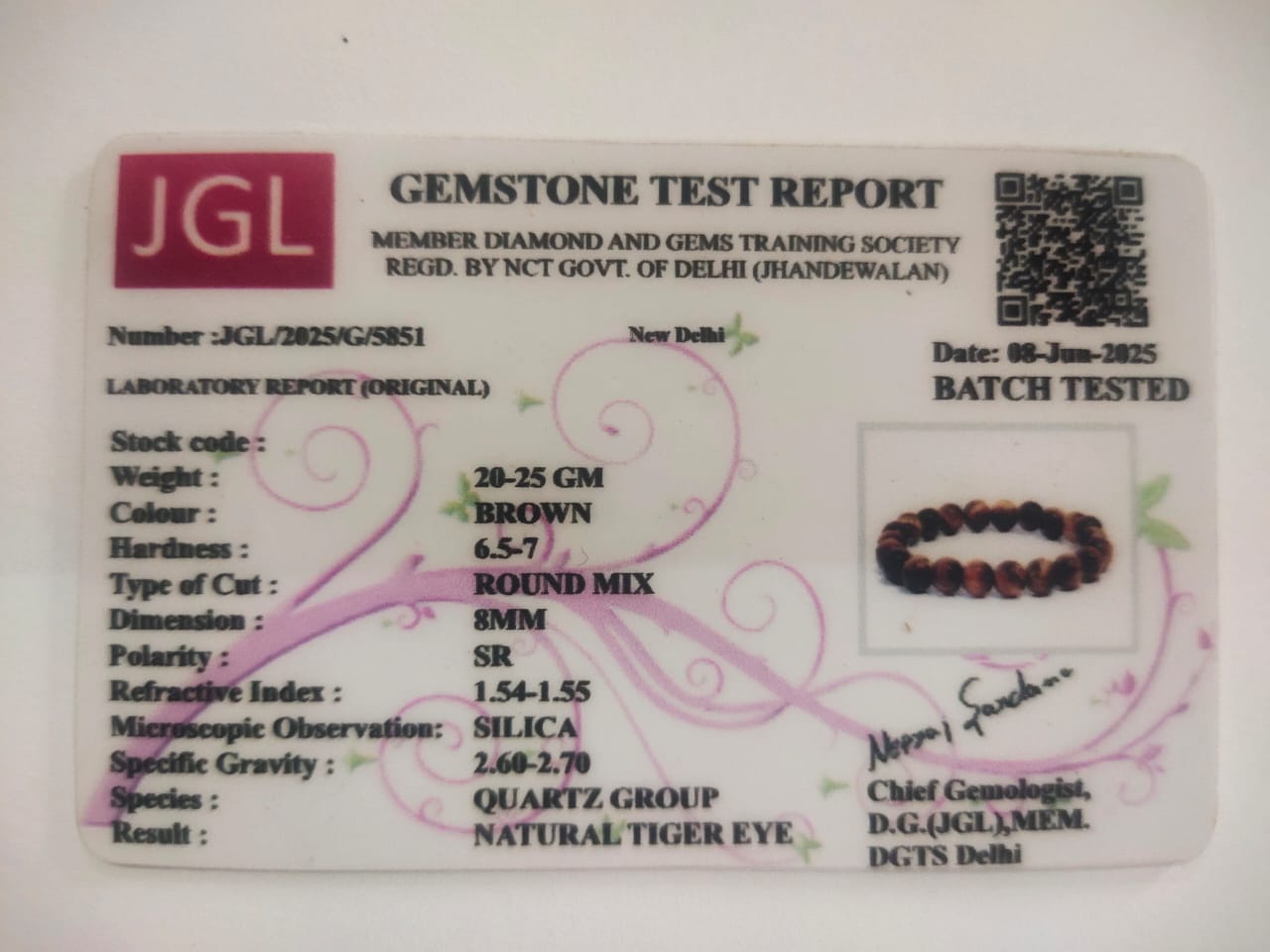 This 8 mm Tiger Eye bracelet combines natural beauty with verified authenticity, accompanied by a lab certificate ensuring genuine quality. Each bead showcases the stone's characteristic chatoyancy, offering both aesthetic appeal and potential grounding benefits. Expertly crafted for durability and style, this bracelet is an ideal accessory for those seeking a blend of elegance and verified authenticity.